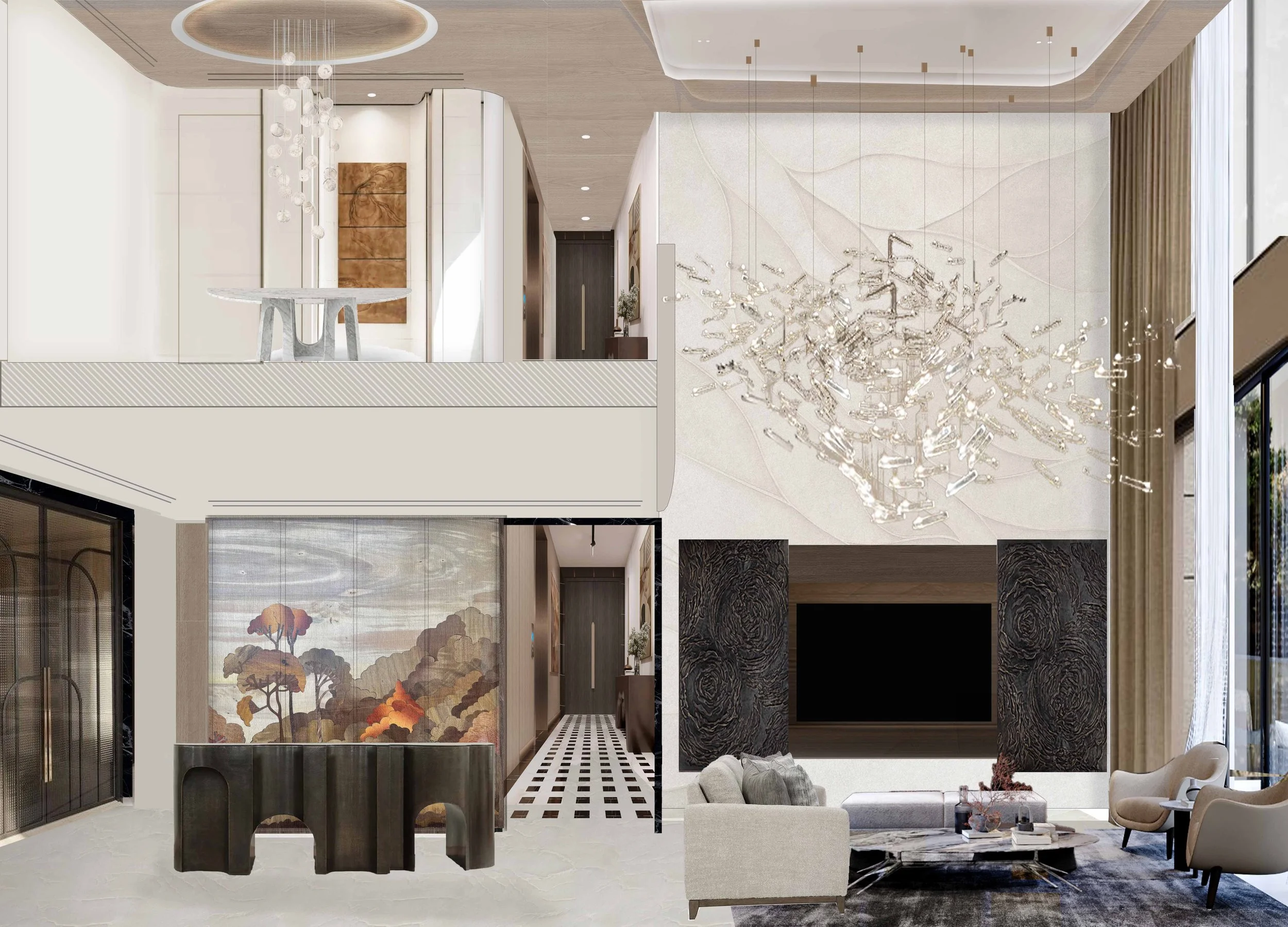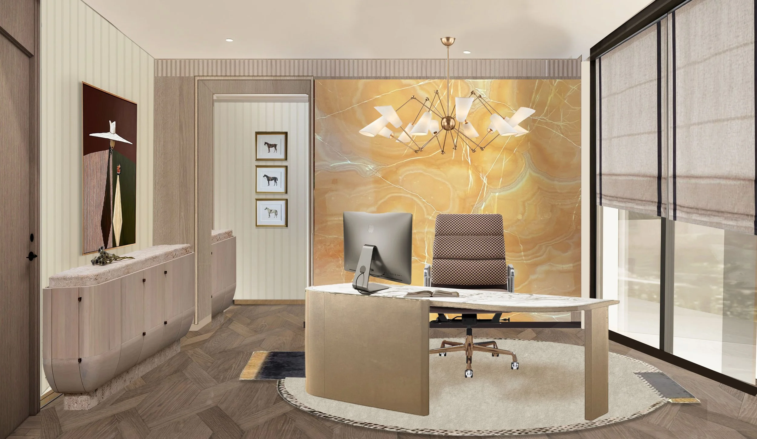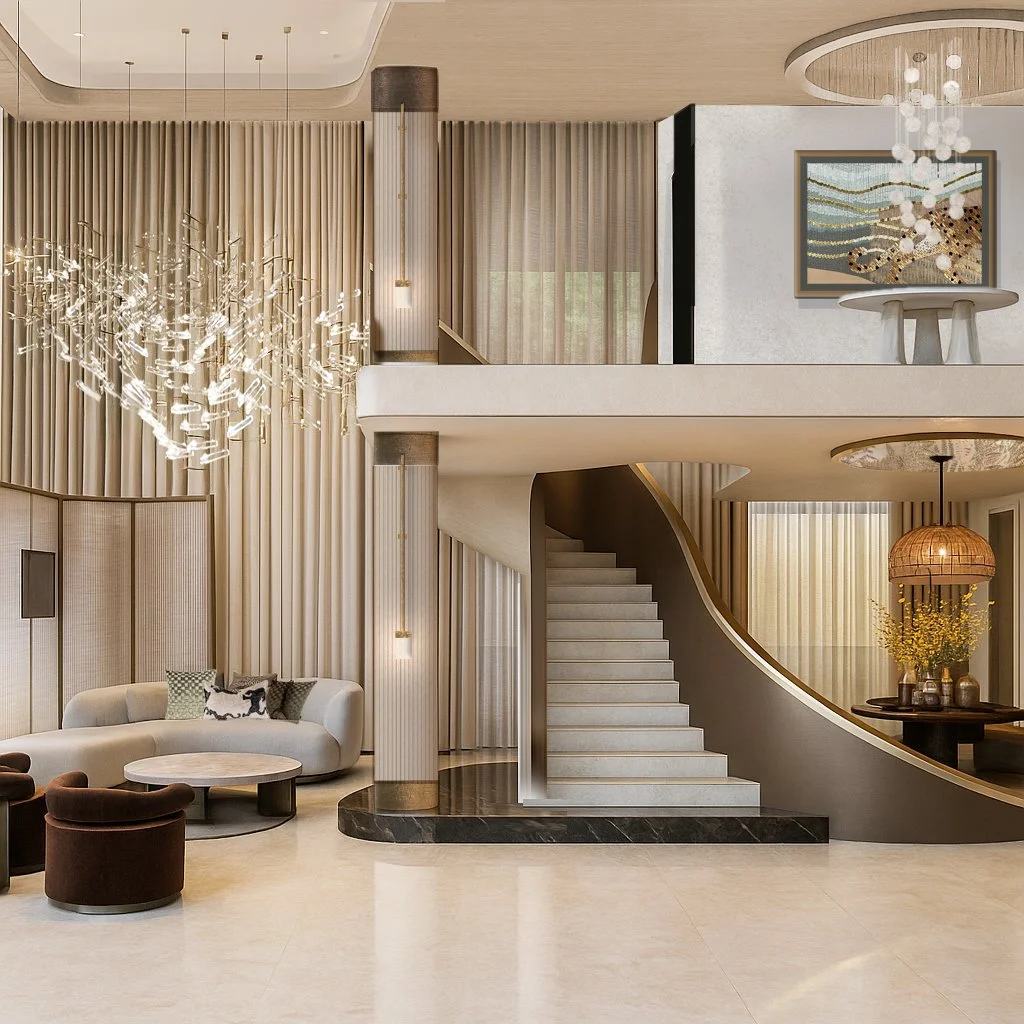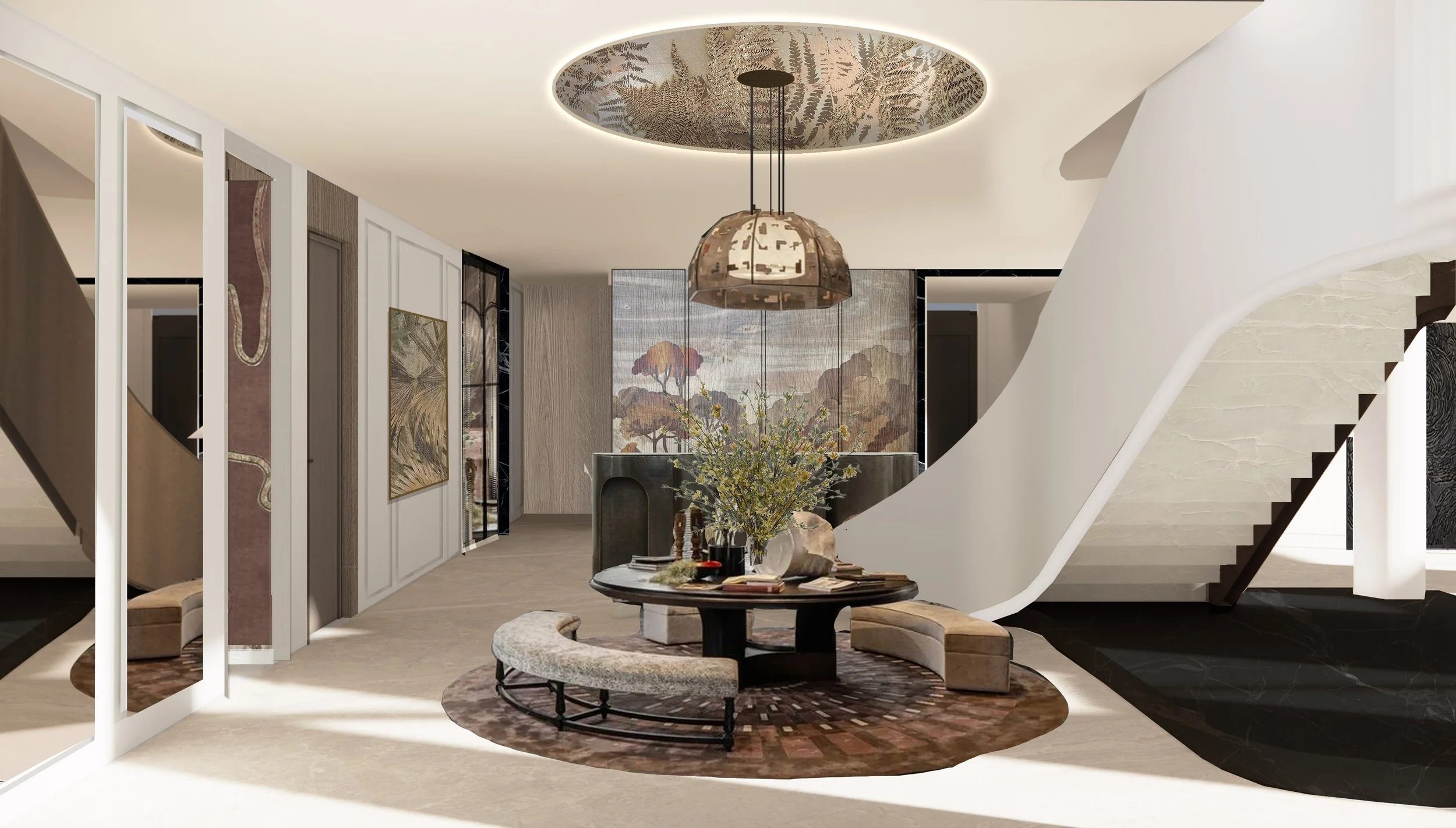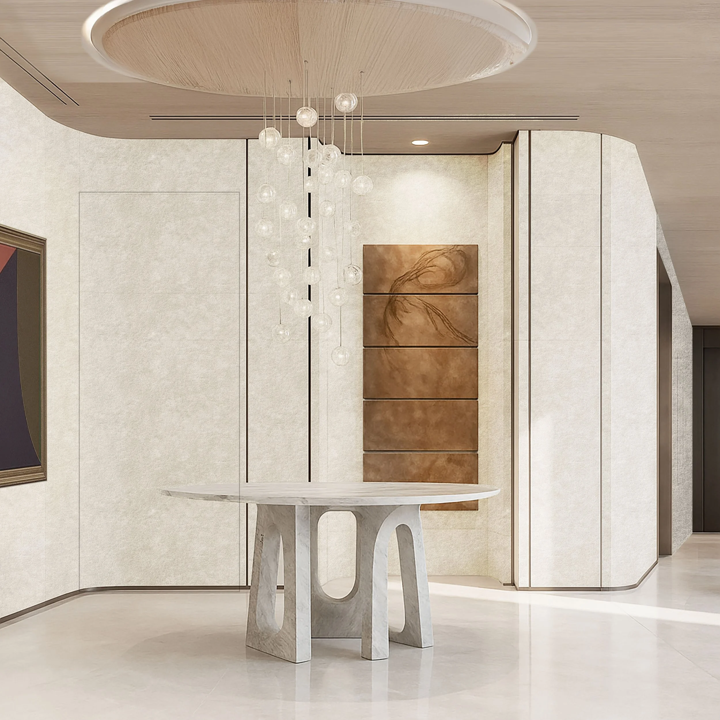 This penthouse is envisioned as a journey through spaces—from sunlit decks and a soaring double-height living room to a refined dining area and an intimate study designed for reflection. Private suites offer indulgent bathrooms, while every corner reflects a dialogue between grandeur and comfort. Designed as the family’s base in India, complementing their other homes abroad, the design blends handcrafted details with modern sophistication, layering textures, light, and proportion to create harmony. This shapes a penthouse that embodies timeless contemporary luxury.