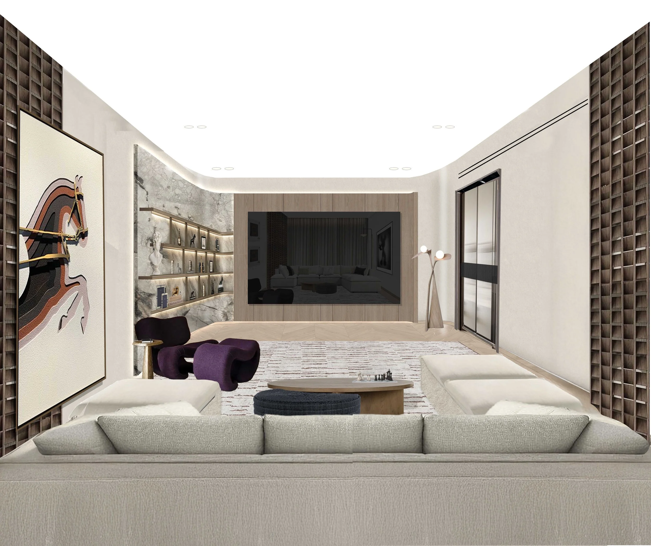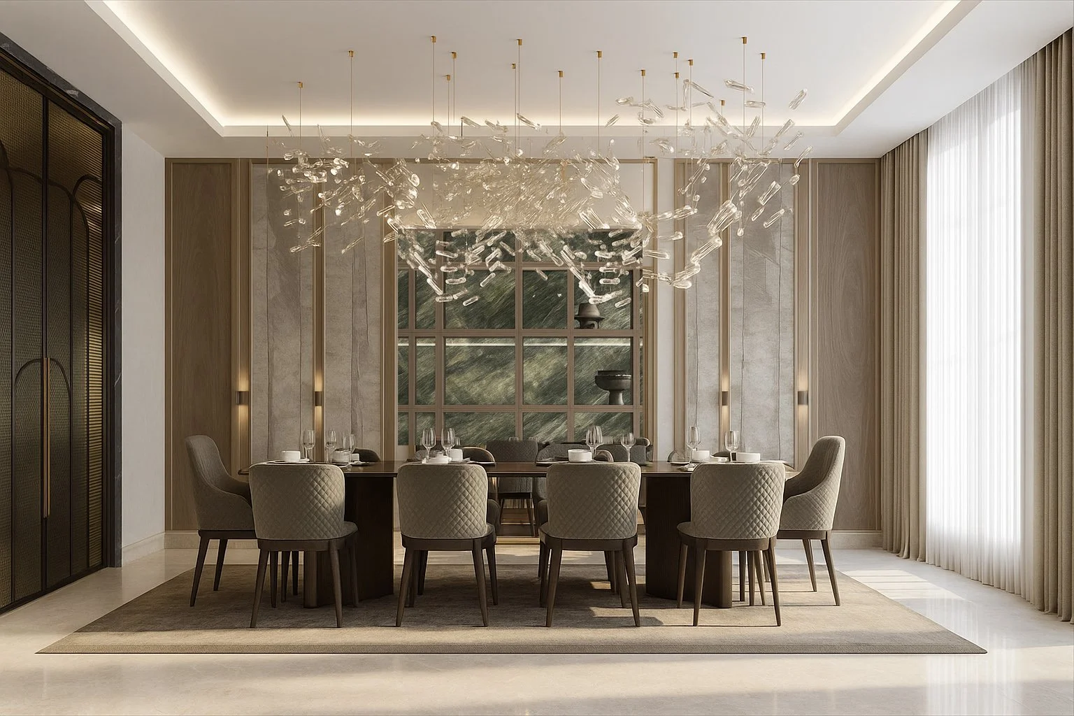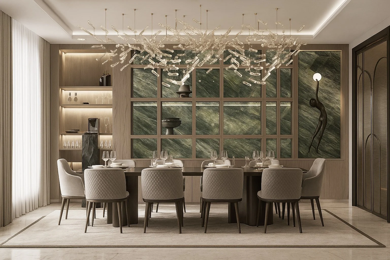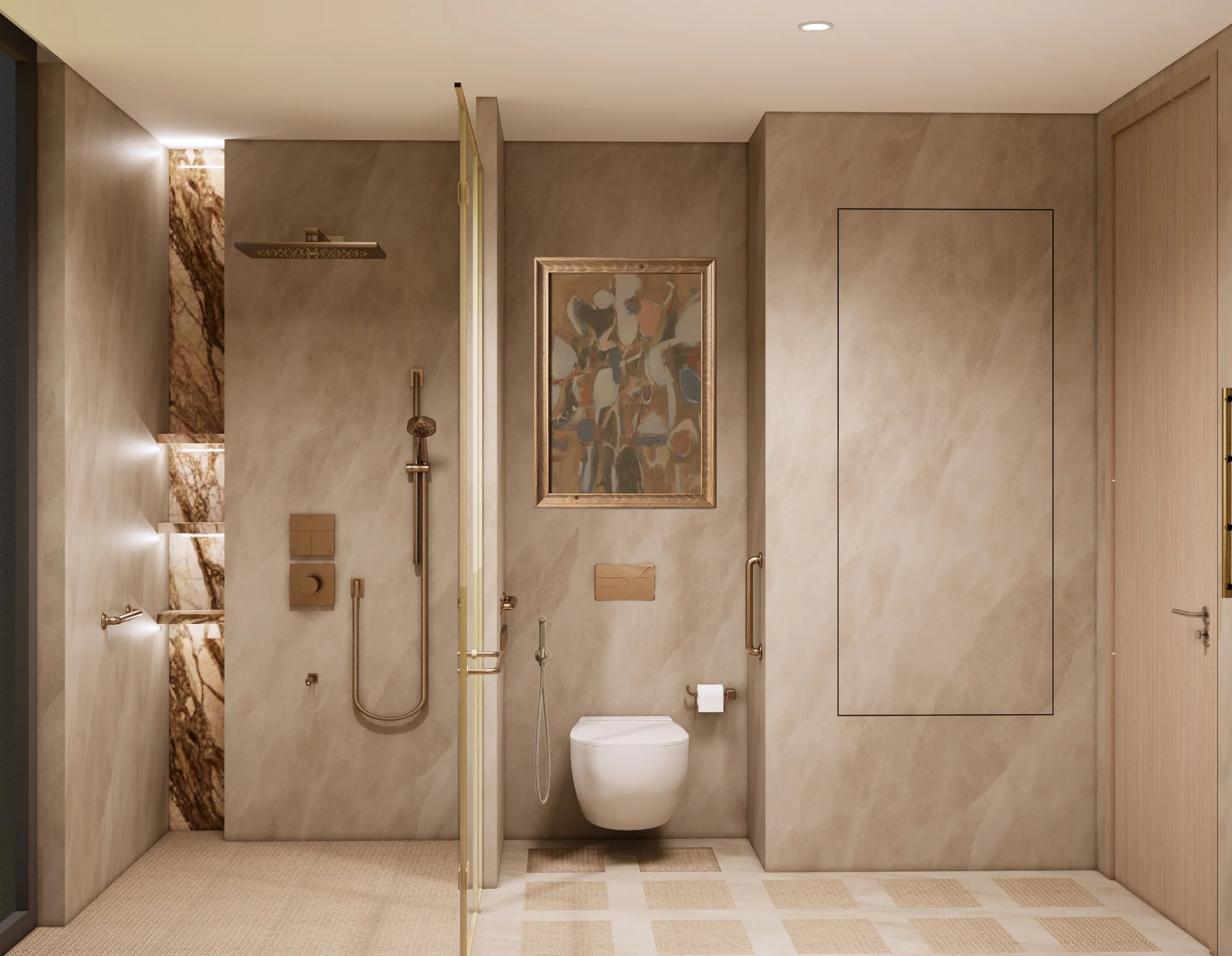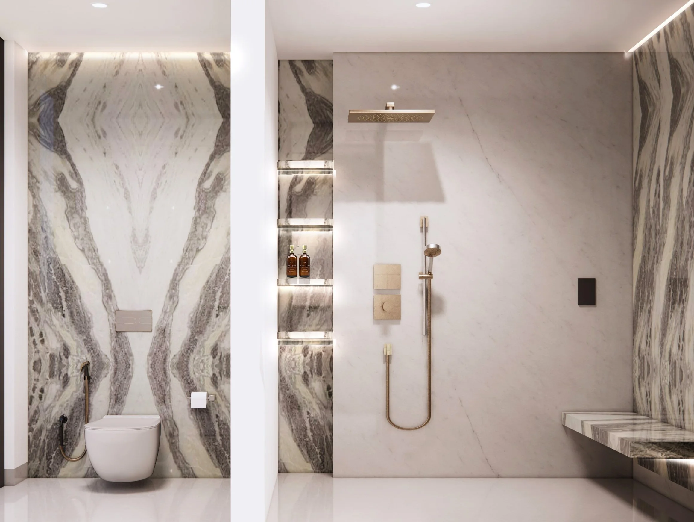This penthouse is envisioned as a journey through spaces—from sunlit decks and a soaring double-height living room to a refined dining area and an intimate study designed for reflection. Private suites offer indulgent bathrooms, while every corner reflects a dialogue between grandeur and comfort. Designed as the family’s base in India, complementing their other homes abroad, the design blends handcrafted details with modern sophistication, layering textures, light, and proportion to create harmony. This shapes a penthouse that embodies timeless contemporary luxury.