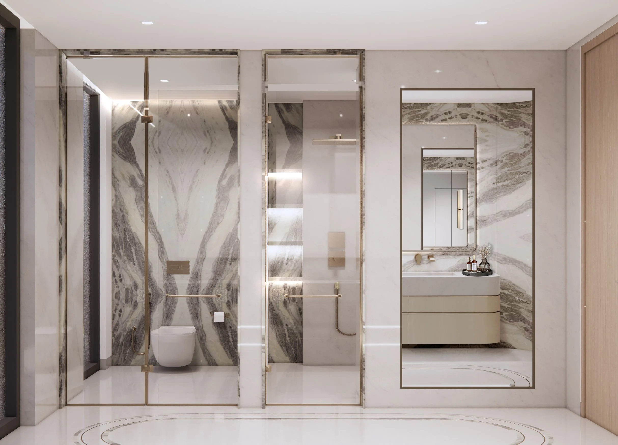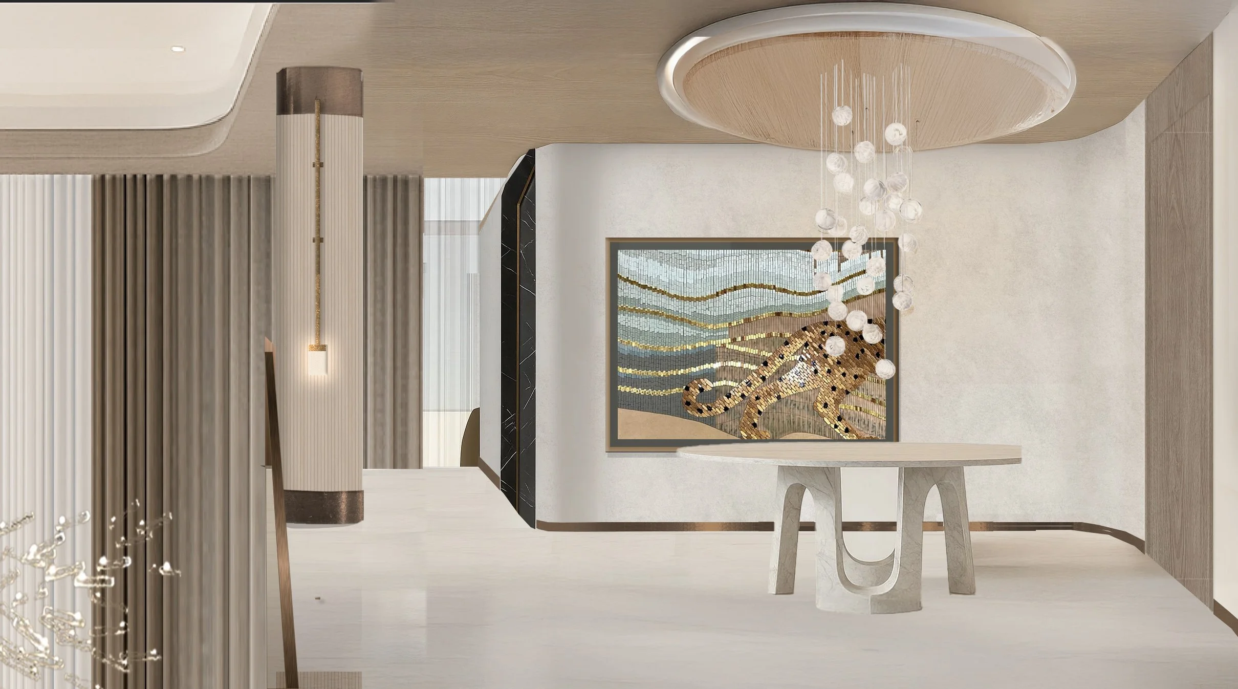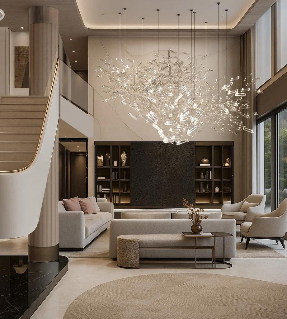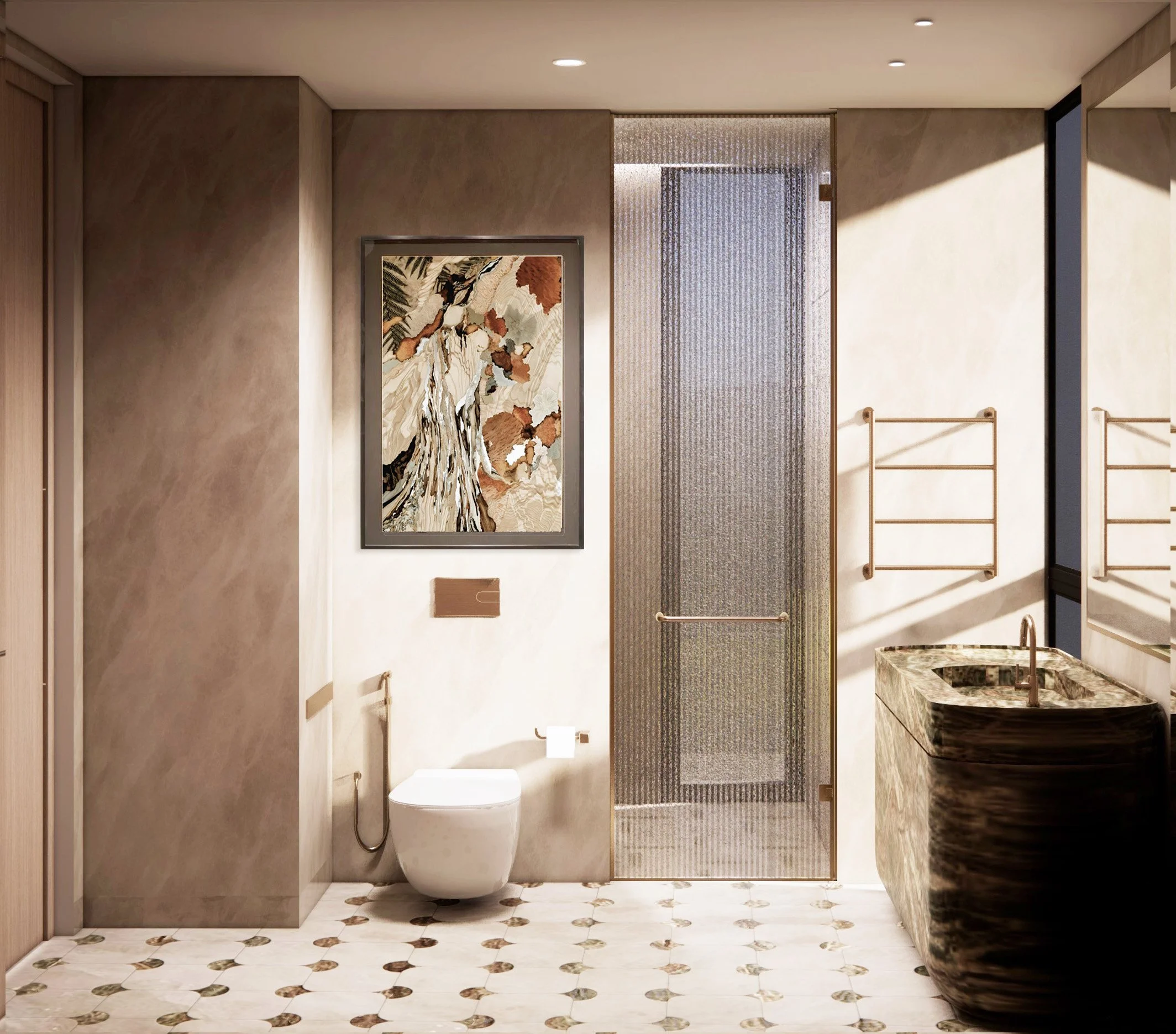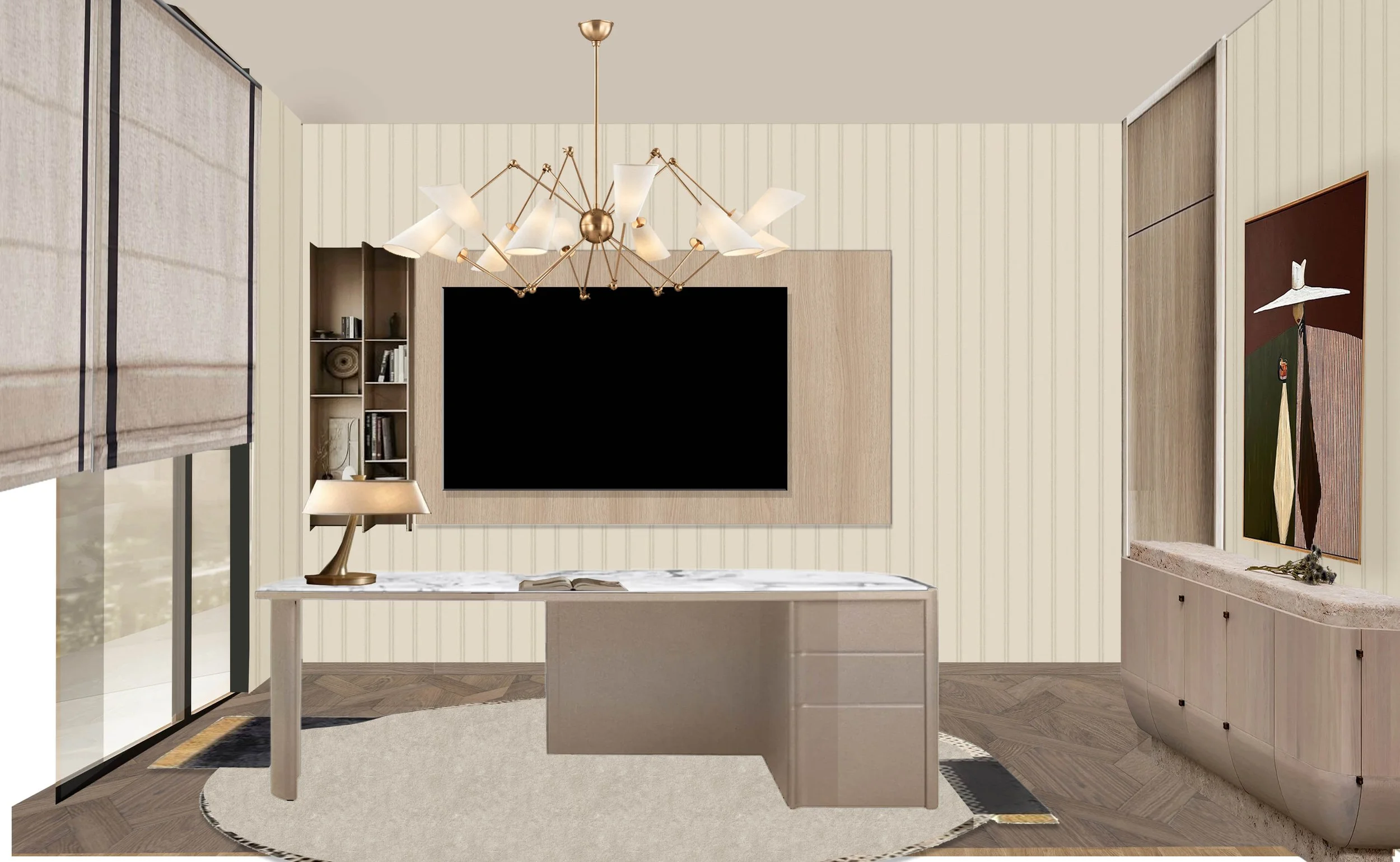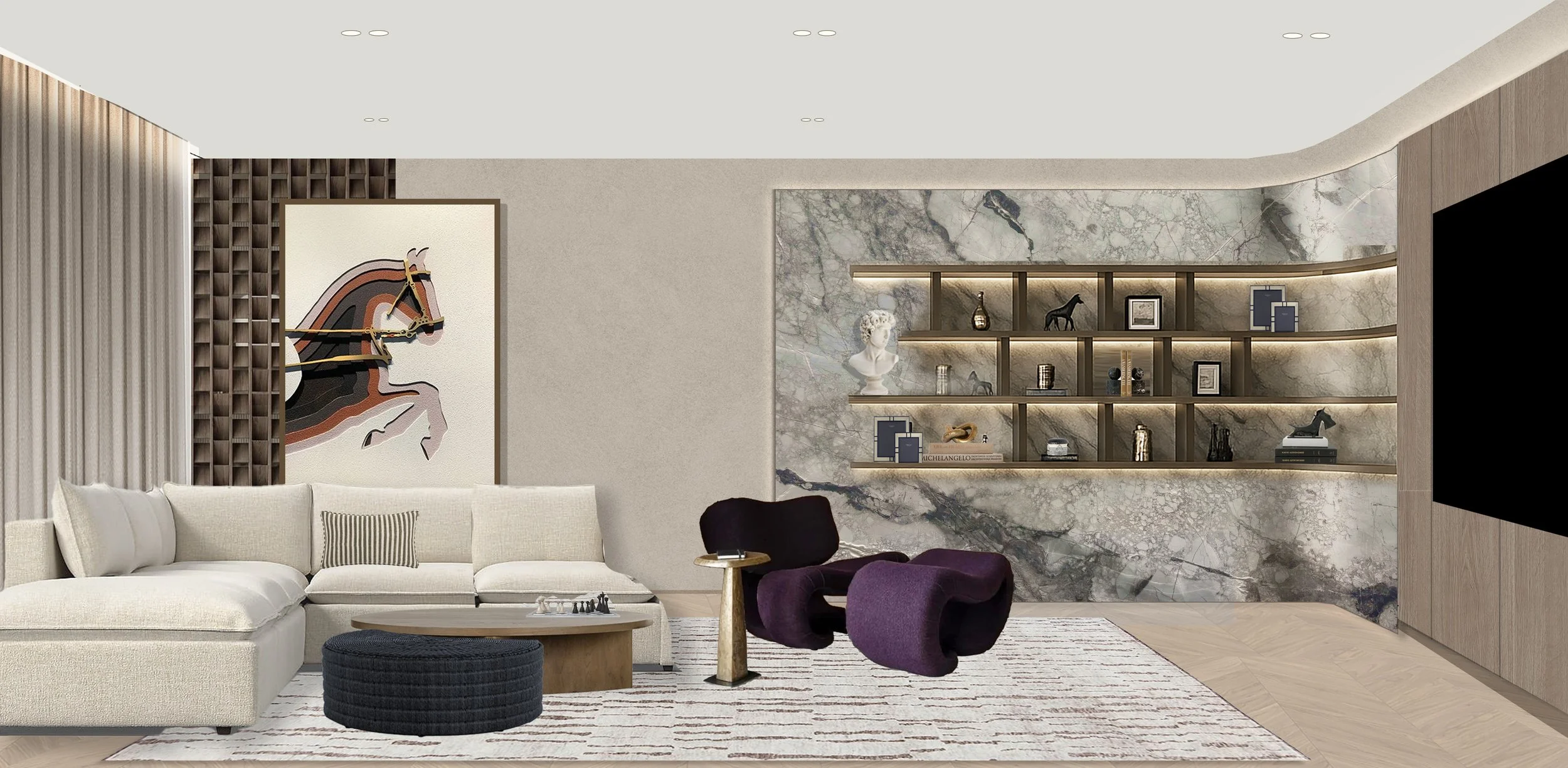 This penthouse is envisioned as a journey through spaces—from sunlit decks and a soaring double-height living room to a refined dining area and an intimate study designed for reflection. Private suites offer indulgent bathrooms, while every corner reflects a dialogue between grandeur and comfort. Designed as the family’s base in India, complementing their other homes abroad, the design blends handcrafted details with modern sophistication, layering textures, light, and proportion to create harmony. This shapes a penthouse that embodies timeless contemporary luxury.