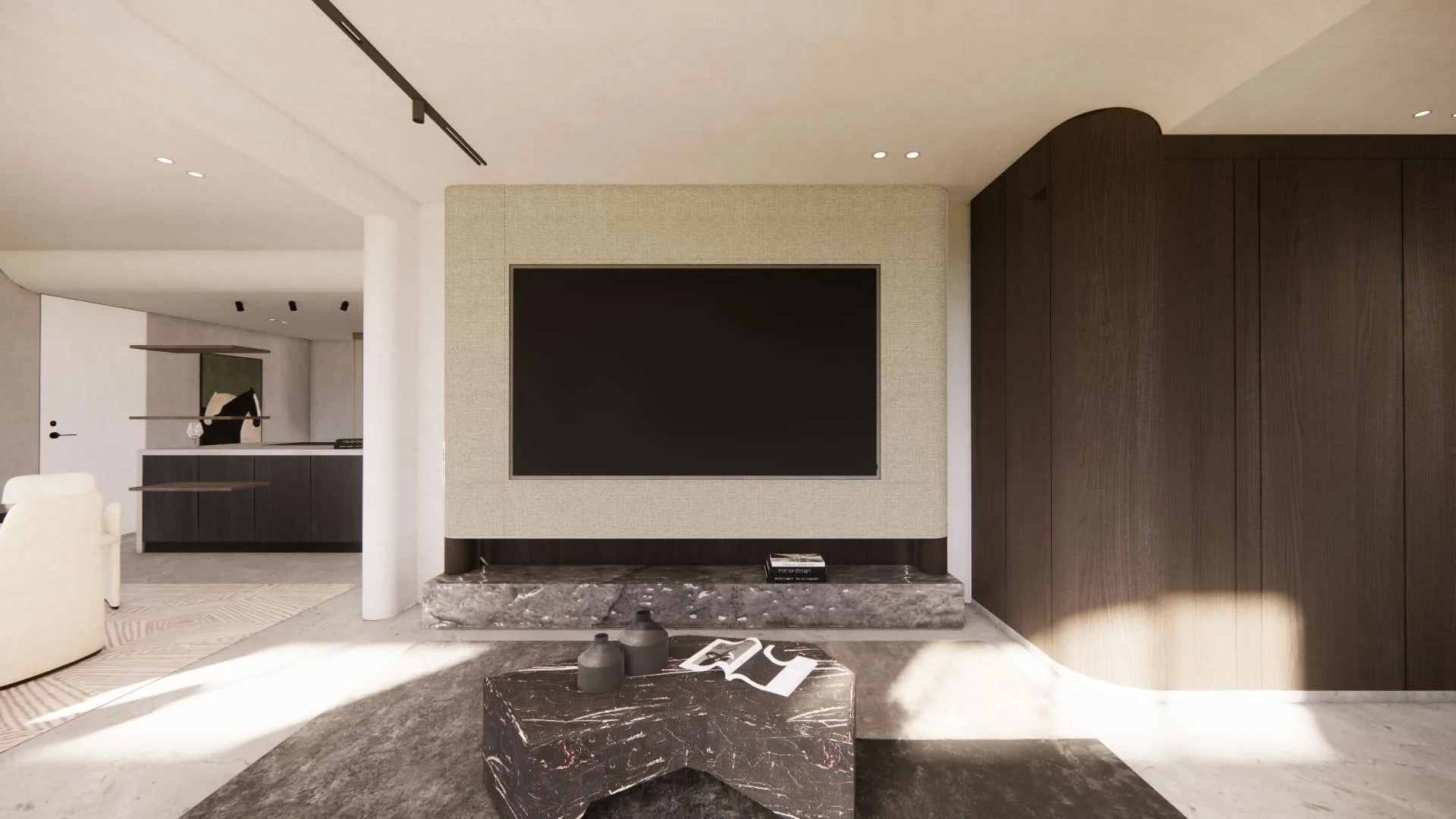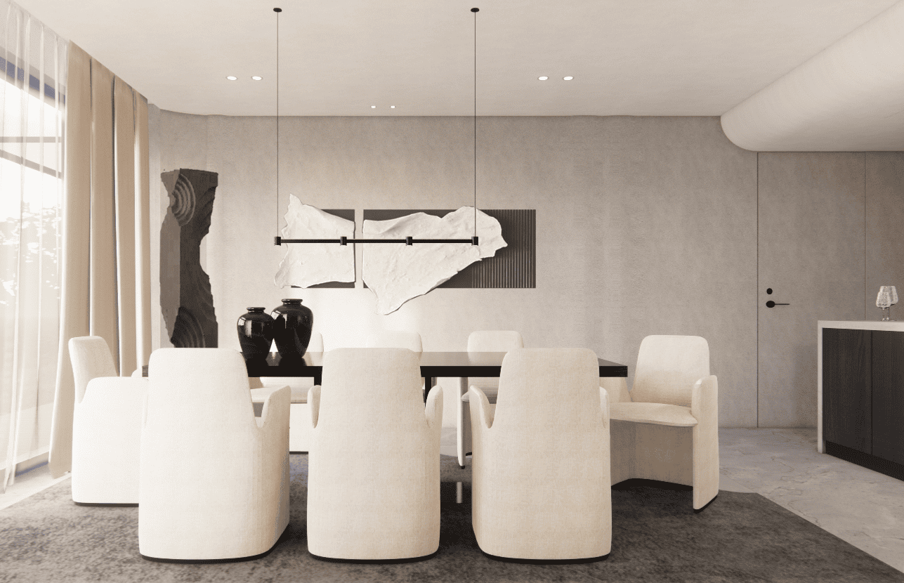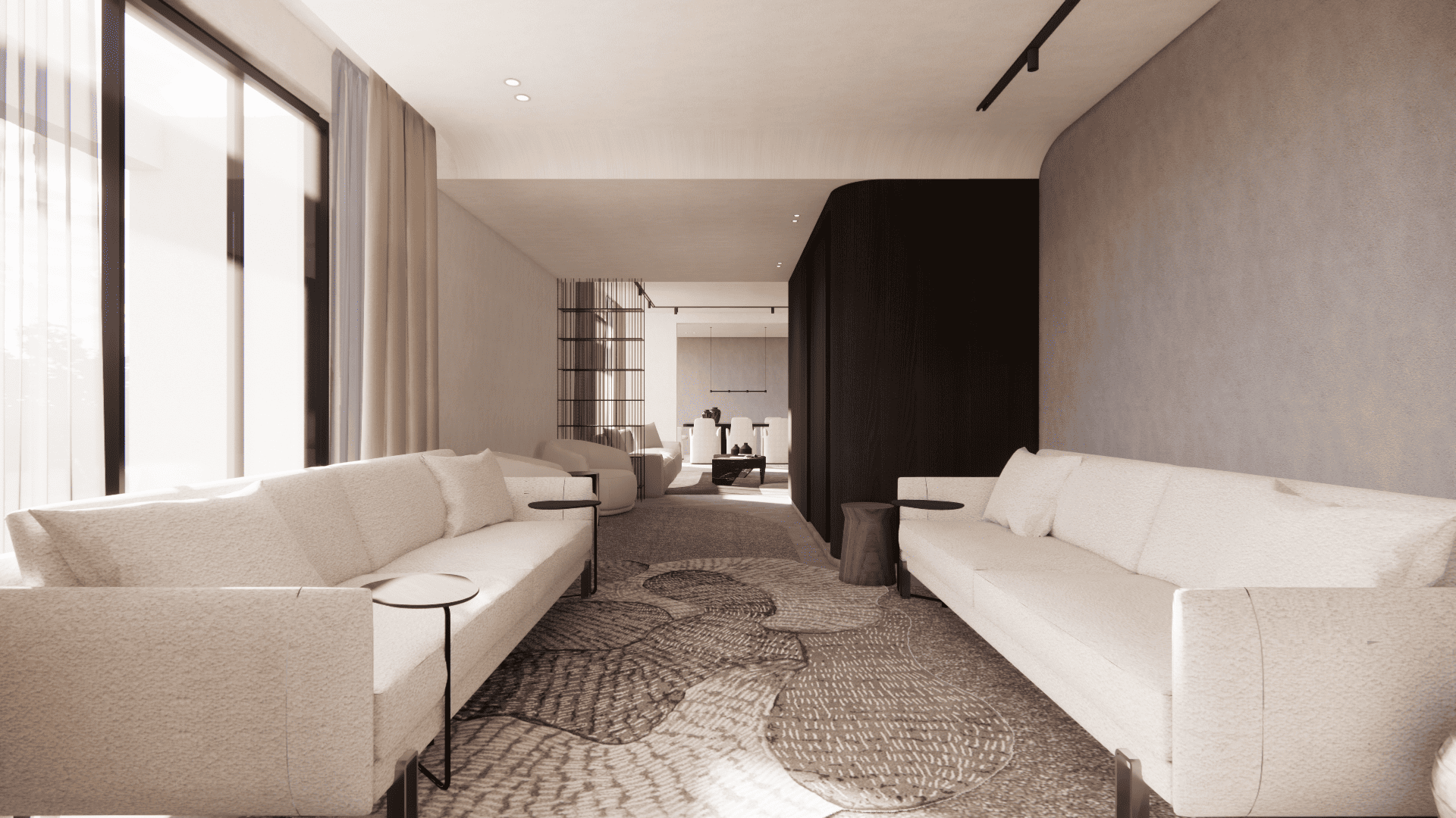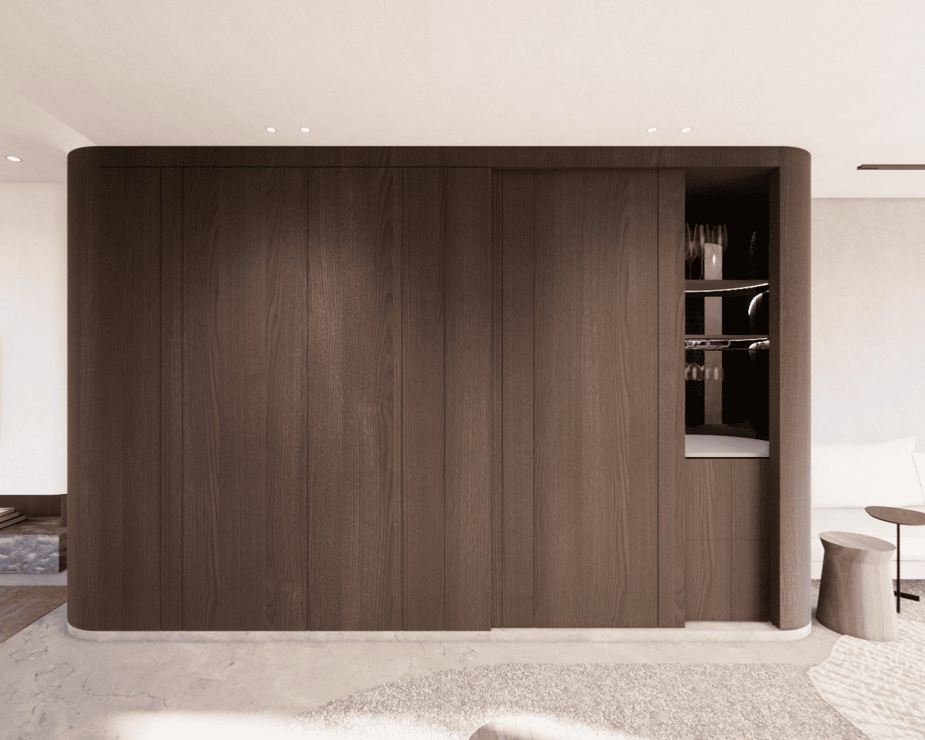 An elegant yet contemporary residence, where every space exudes quiet sophistication. The expansive foyer sets a welcoming tone with refined finishes. The long passage is used as a social space with a curated bar and lots of comfortable seating. Hidden doors open into private areas like the master suite and bedrooms, layered with calm palettes and bespoke details. Seamless texture paint flows across walls and ceilings, creating an interesting canvas to showcase the client's personality. The apartment embodies modern living with timeless charm.