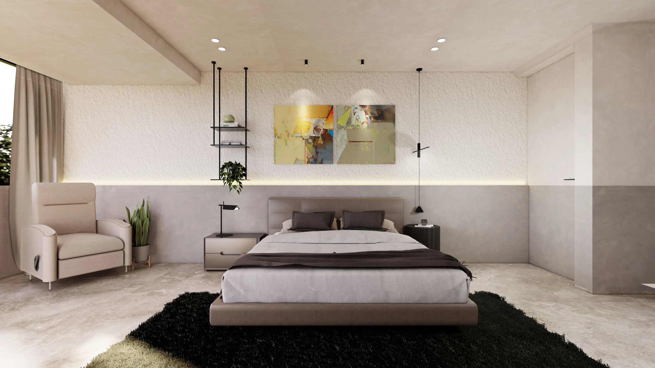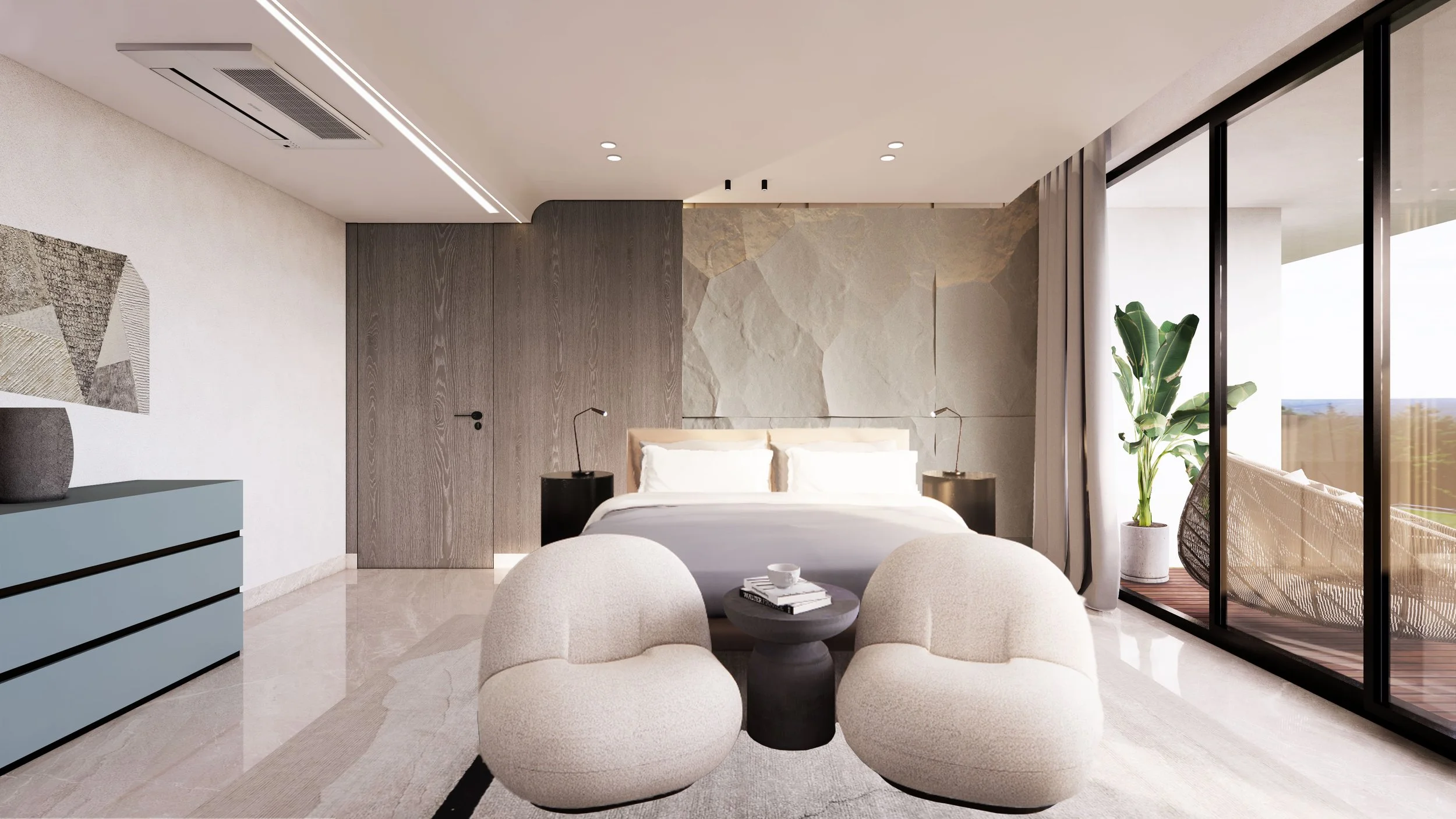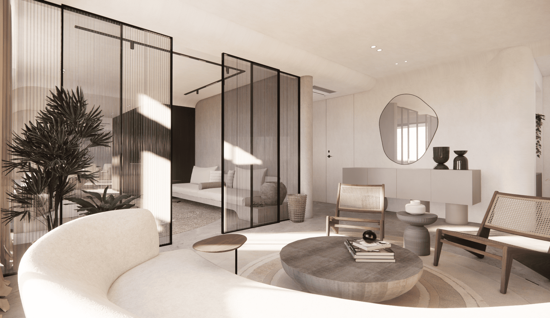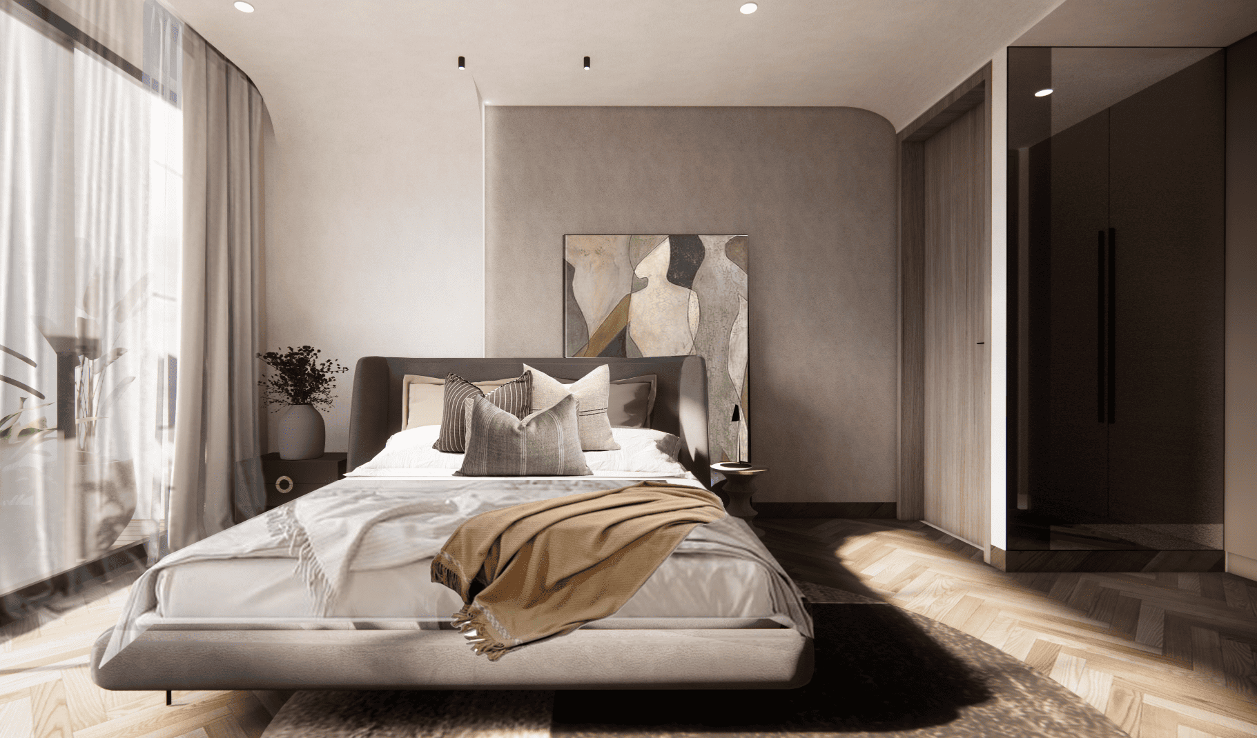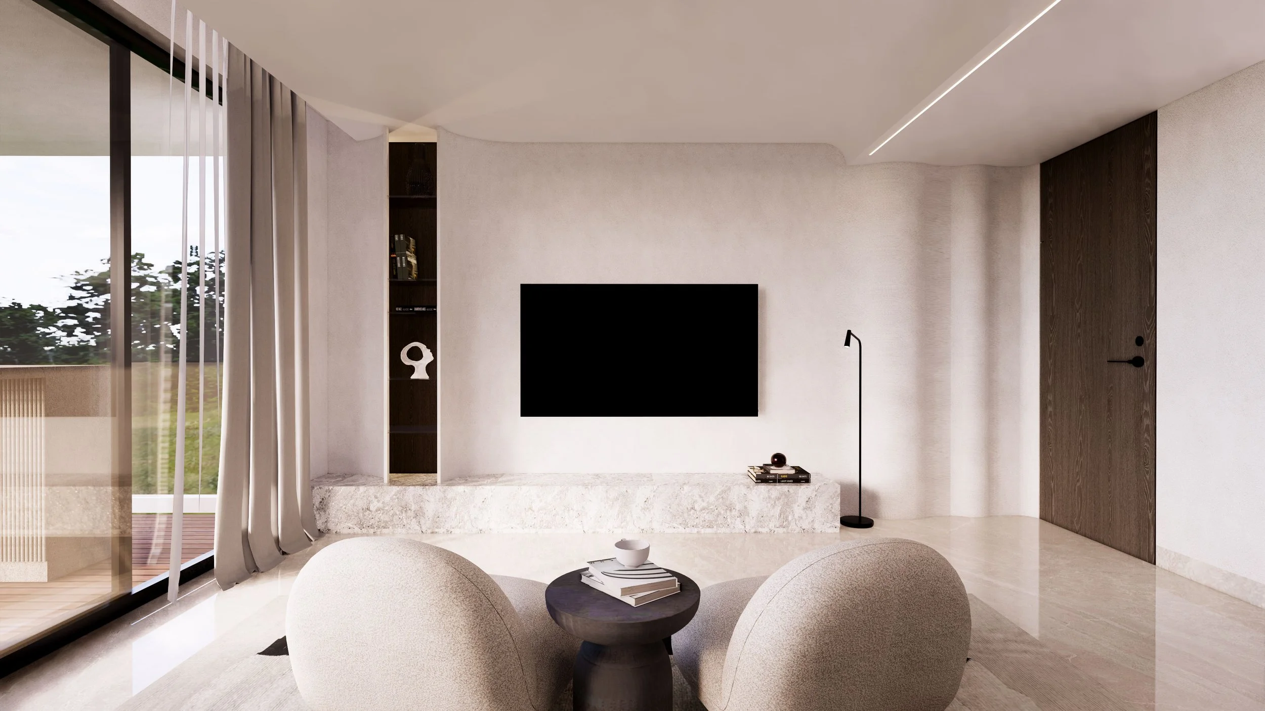 An elegant yet contemporary residence, where every space exudes quiet sophistication. The expansive foyer sets a welcoming tone with refined finishes. The long passage is used as a social space with a curated bar and lots of comfortable seating. Hidden doors open into private areas like the master suite and bedrooms, layered with calm palettes and bespoke details. Seamless texture paint flows across walls and ceilings, creating an interesting canvas to showcase the client's personality. The apartment embodies modern living with timeless charm.