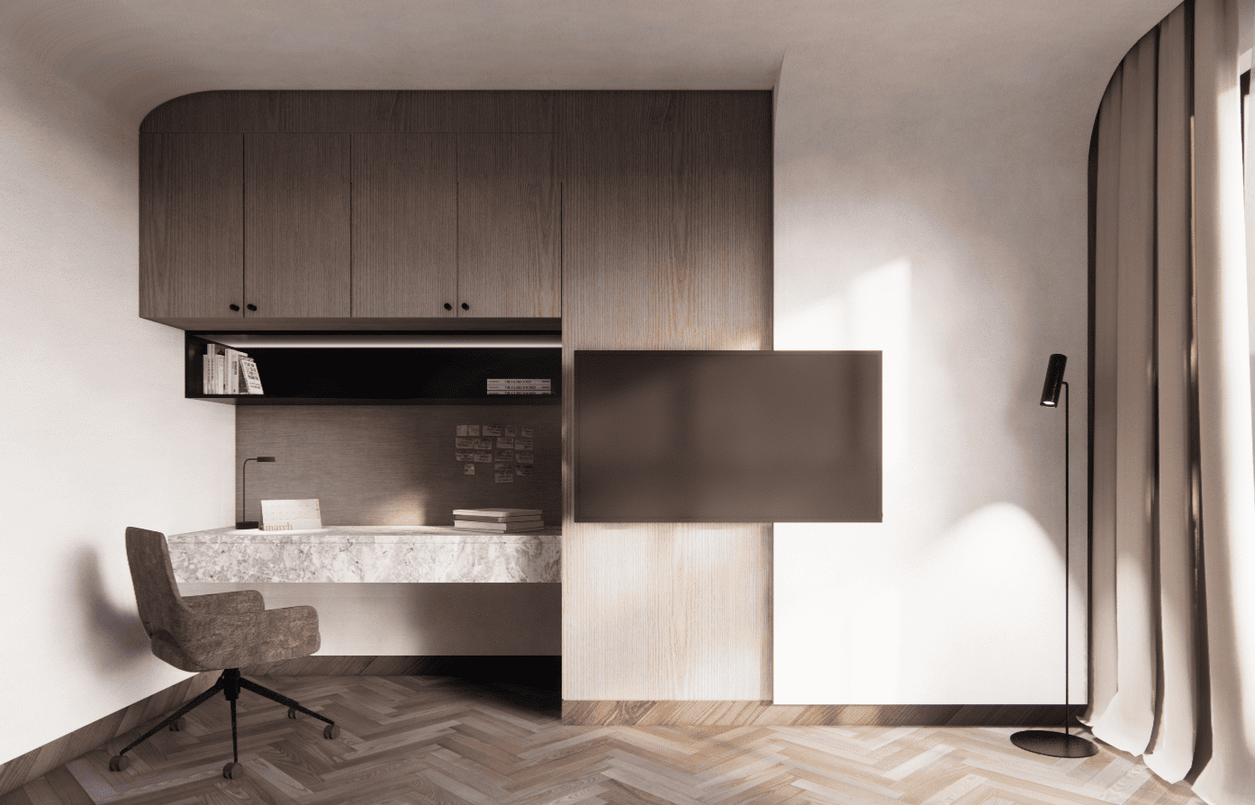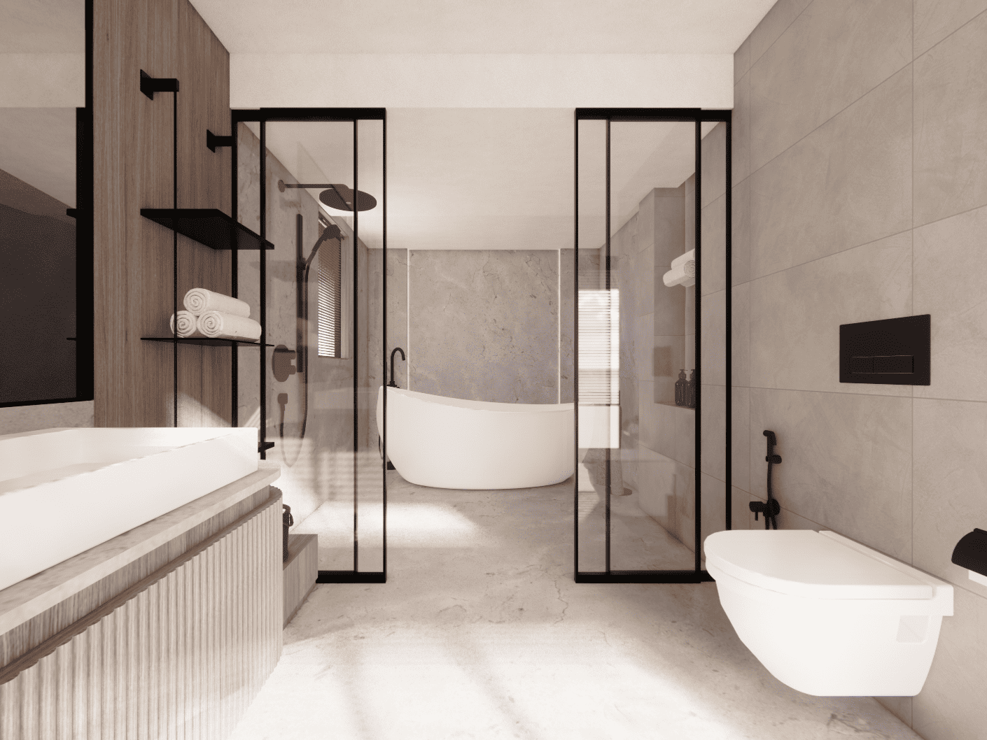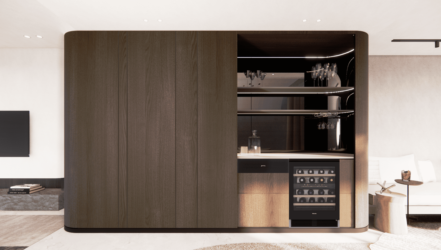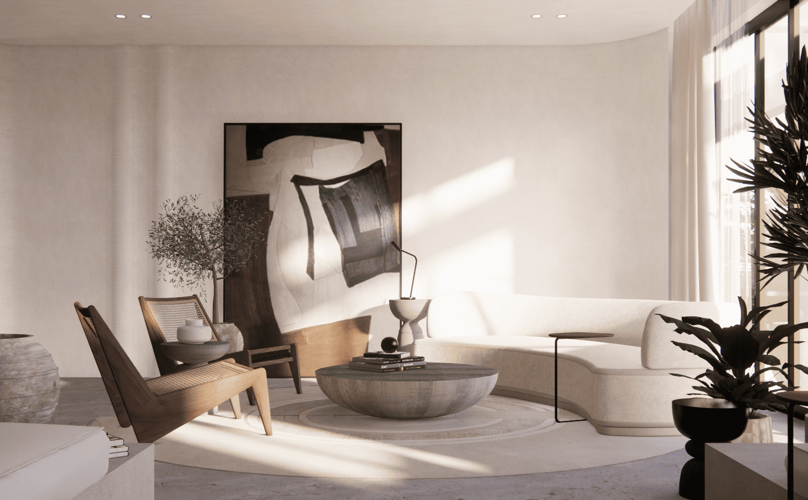 An elegant yet contemporary residence, where every space exudes quiet sophistication. The expansive foyer sets a welcoming tone with refined finishes. The long passage is used as a social space with a curated bar and lots of comfortable seating. Hidden doors open into private areas like the master suite and bedrooms, layered with calm palettes and bespoke details. Seamless texture paint flows across walls and ceilings, creating an interesting canvas to showcase the client's personality. The apartment embodies modern living with timeless charm.